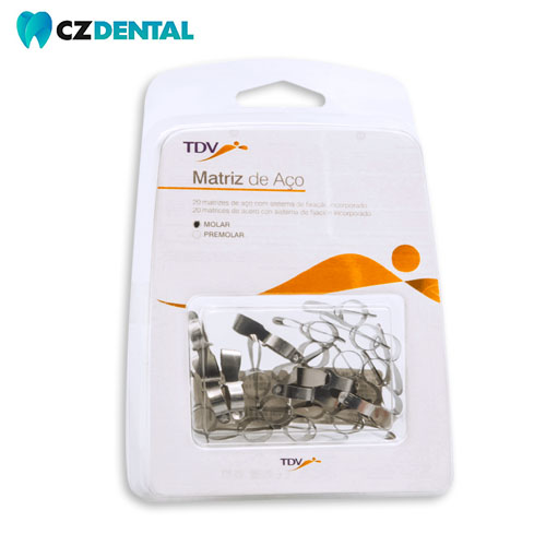 Las Matrices para restauraciones Clase II de TDV son pre-contorneadas y poseen un sistema de fijación incorporado que permite una mejor adaptación al tamaño del diente, fijándolas firmemente y dispensando del uso del portamatriz.